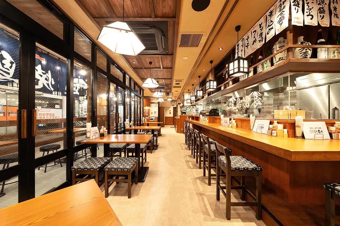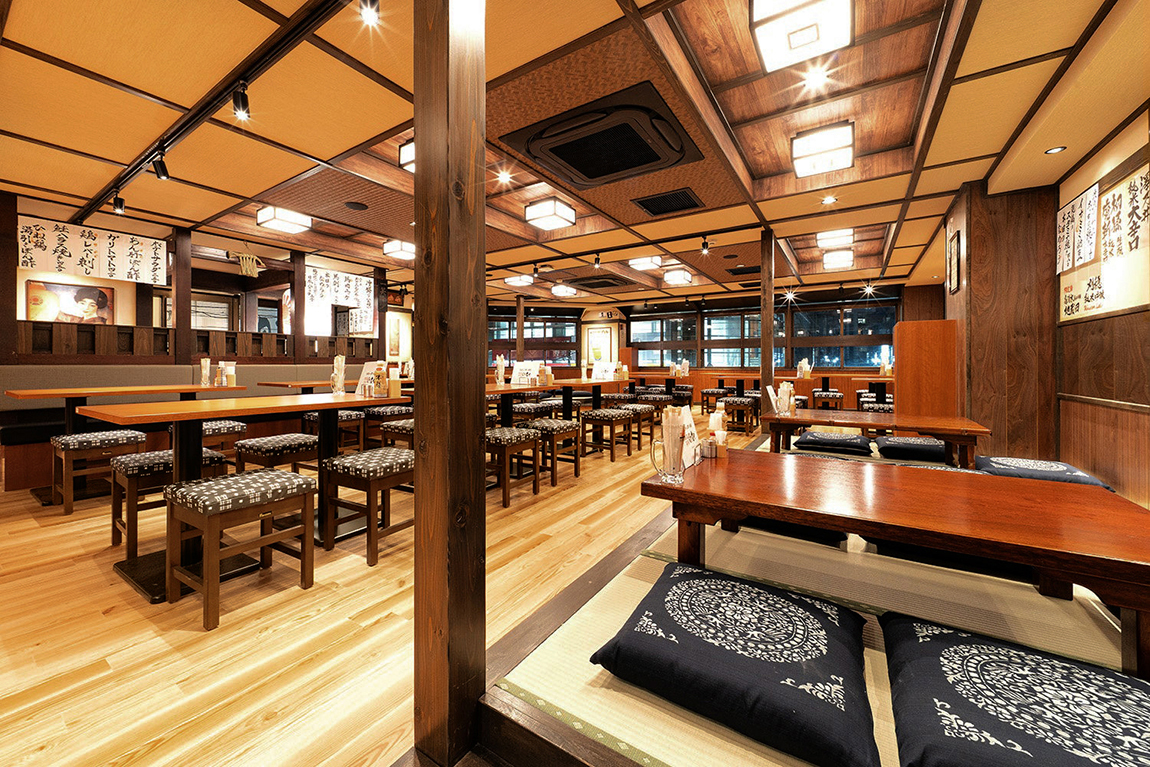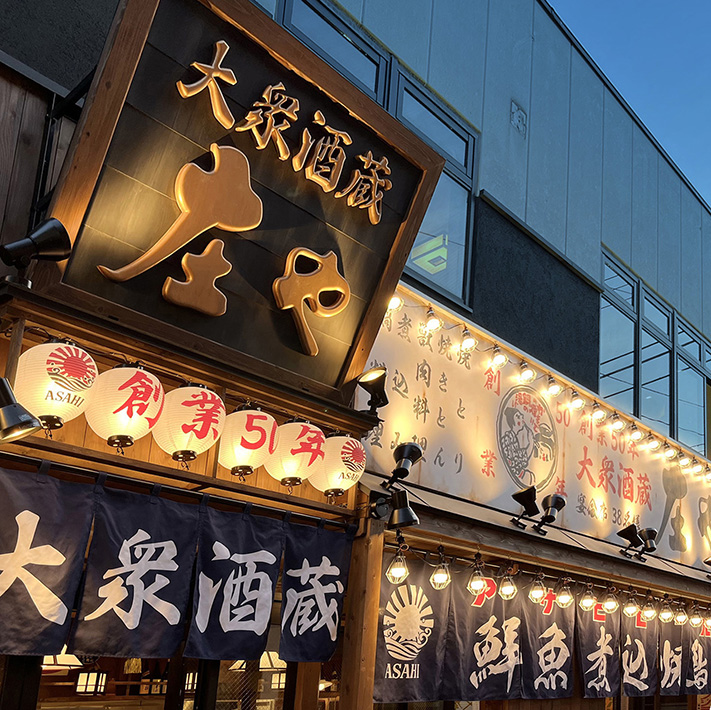 大衆酒蔵庄や 本八幡店/川崎408店/立川南口店 50周年を迎えた歴史ある老舗居酒屋『板前がいる町の酒場』庄や。令和における大衆酒場とはどのような空間なのか検討を重ね、各店舗のデザインに取り組みました。懐かしくて新しい、新しいけど懐かしい。チェーン店だけど、空間にはこだわりがあり、温もりもしっかり感じられて、ふらっと気軽に入りやすい雰囲気がある。各店舗が地域に根差し地域の人たちに親しまれ、この先何十年と月日を重ねて少しずつ成長していく、そんな店舗になりました。 DESIGN;sidedesign inc.